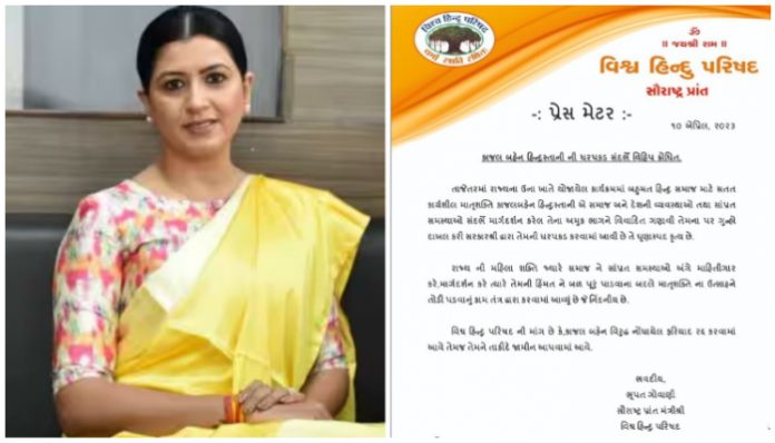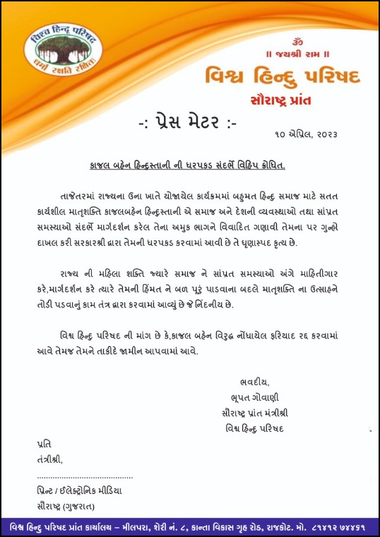 The Vishwa Hindu Parishad on Monday (April 10) condemned the arbitrary action taken by Gujarat police against Hindu activist Kajal Hindustani and demanded her immediate release. In a press release dated April 10, the Hindu organisation also demanded that the FIR filed against the Hindu activist be quashed with immediate effect.