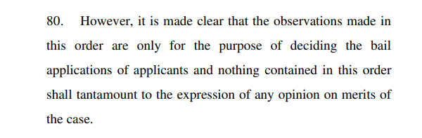 In fact, the order makes it clear that the observations are related to the bail applications only, and they are not comments on the merits of the case. In para 80 of the judgement, the judge states, “However, it is made clear that the observations made in this order are only for the purpose of deciding the bail applications of applicants and nothing contained in this order shall tantamount to the expression of any opinion on merits of the case.”