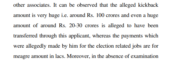 In fact, the judgement makes it clear that the Rs 30 crore is part of the total Rs 100 crore alleged kickback. It says, “It can be observed that the alleged kickback amount is very huge i.e. around Rs. 100 crores and even a huge amount of around Rs. 20-30 crores is alleged to have been transferred through this applicant.”