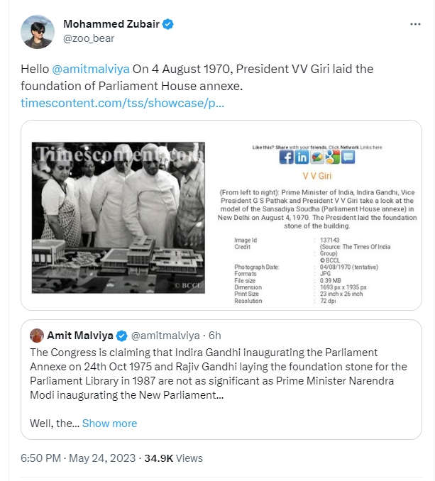 In this argument between Congress and BJP leaders, Md Zubair of Alt News decided to jump in, claiming that BJP leaders were lying that Indira Gandhi inaugurated the Parliament annexe in 1975. He tweeted, “Hello @amitmalviya On 4 August 1970, President VV Giri laid the foundation of Parliament House annexe,” in an apparent attempt to fact check BJP. He also posted a link to a report saying that former president Giri had laid the foundation stone of the Parliament House annexe.