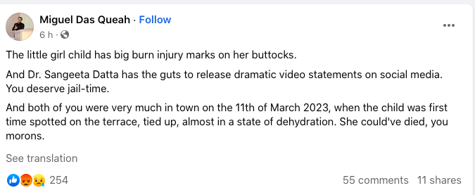 Reacting to this, child rights activist Miguel Das Queah said that the minor has sustained injuries due to the torture inflicted by the couple. In a Facebook post shared hours ago, Queah wrote, “The little girl child has big burn injury marks on her buttocks. And Dr Sangeeta Datta has the guts to release dramatic video statements on social media. You deserve jail time. And both of you were very much in town on the 11th of March 2023, when the child was first time spotted on the terrace, tied up, almost in a state of dehydration. She could’ve died, you morons.”