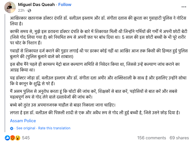 “This doctor couple Dr. Waliul Islam and Dr. Sangeeta Dutta hobnob with the rich and the powerful and therefore they thought that they are beyond the purview of the law. I request the Assam Police to check the bruises, talk with the teachers, talk with the neighbours, and most importantly check the adoption documents. The child should immediately be pulled out of that abusive environment,” the post further said.