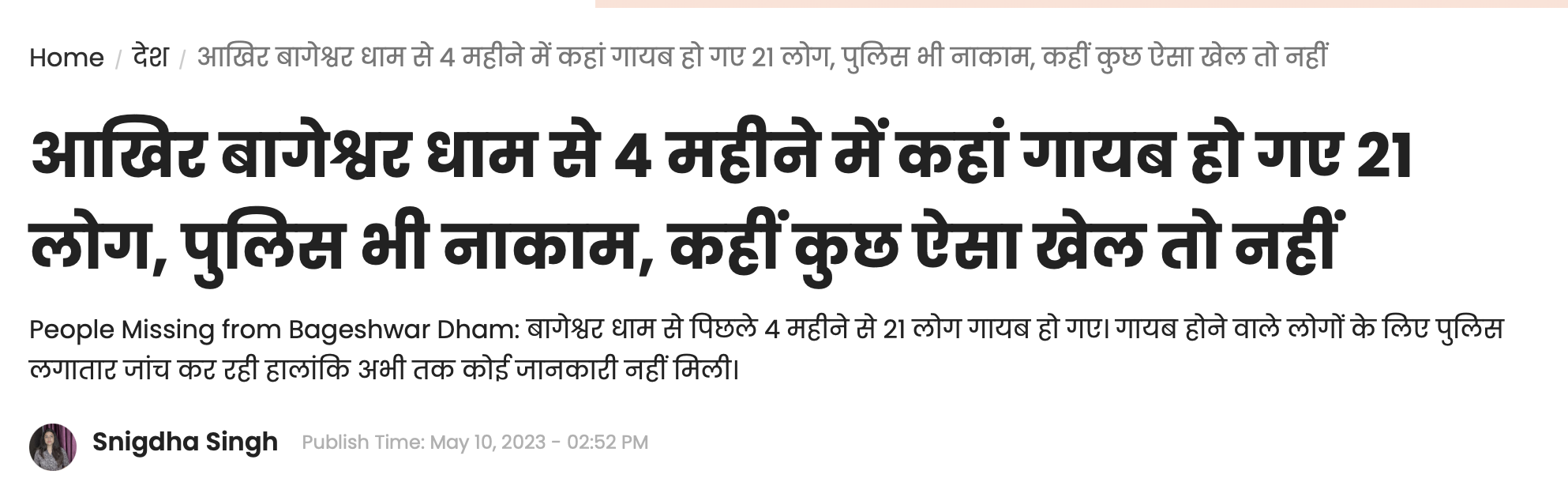 On May 10th, Newstrack published a report claiming that 21 people had gone missing from Bageshwar Dham since January 2023. In the headline itself, the insinuation was pretty clear.