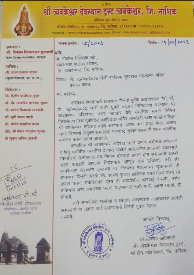 The administrative officer of the Shri Trimbakeshwar Devasthan Trust sent a letter to the Trimbakeshwar police inspector, detailing an incident that occurred on May 13 at approximately 9:41 PM. According to the letter, during the procession of the urus near the north gate of the Shri Trimbakeshwar Mandir, certain participants from the urus attempted to enter the temple premises. However, the security personnel from the Maharashtra police promptly intervened and prevented the Muslims from gaining entry.