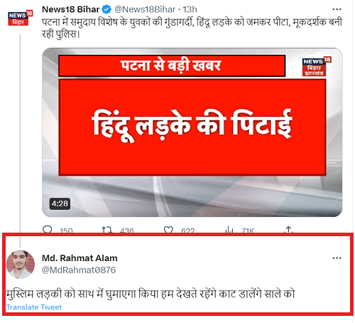 One of the netizens said that Hindus will be killed if found with a Muslim woman. “Muslim ladki ko ghumayega to hum kya dehte rahenge? Kaat dalenge. (We’ll not just see, we’ll kill them if found roaming around with Muslim girl),” one of the users named Mohammad Rehmat Alam said.