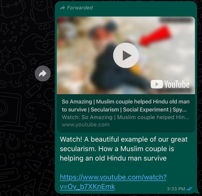 Earlier in the day, similar video made rounds on WhatsApp saying, “Watch! A beautiful example of our great secularism. How a Muslim couple is helping a old Hindu man survive.” The Muslim woman and her husband in the video could be seen helping a old man posed as Hindu priest and offering medicine.
