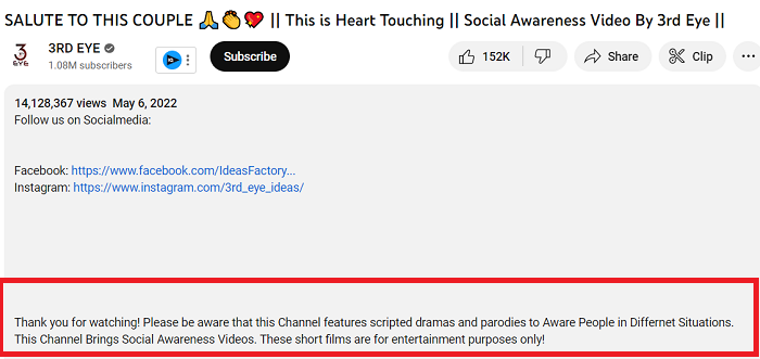 “Thank you for watching! Please be aware that this Channel features scripted dramas and parodies to Aware People in Differnet Situations. This Channel Brings Social Awareness Videos. These short films are for entertainment purposes only!” the channel mentioned in the description box of the said video.