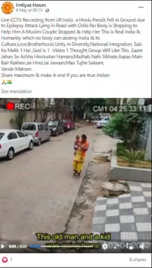 The video was also shared last year by several Muslim users on Facebook who captioned the video saying, “Live CCTV Recording from UP, India a Hindu Pandit Fell in Ground due to Epilepsy Attack Lying in Road with Child No Body is Stopping to Help Him A Muslim Couple Stopped and Help Her This is Real India and Humanity which no body can destroy India and its Culture, Love, Brotherhood, Unity in Diversity, National integration… Share maximum and make it viral if you are true Indian.”