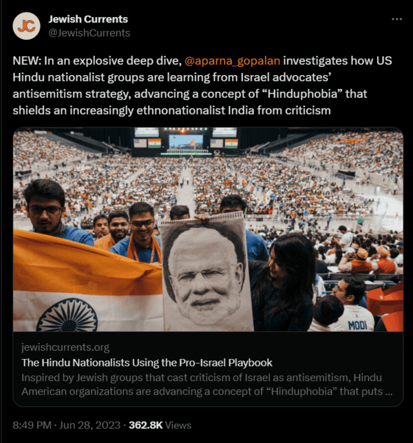She wrote, “The HAF has also worked to mainstream the notion that “Hinduphobia” is running rampant in American society.” The news editor of Jewish Currents then went on to suggest that hate crimes against Hindus in the United States are ‘few’, ‘isolated’ and not necessarily the result of ‘Hinduphobia.’