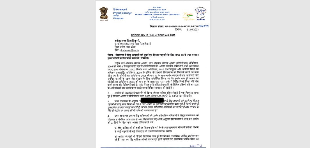 Priyank Kanoongo, the head of the National Commission for the Protection of Child Rights (NCPCR) tweeted, “A complaint has been received about a school in Madhya Pradesh’s Damoh district forcing Hindu and other non-Muslim girls to wear burqas and hijabs in the name of school uniforms. Cognizance of this is being taken and instructions are being sent to Collector Damoh and Superintendent of Police, Damoh for necessary action.”