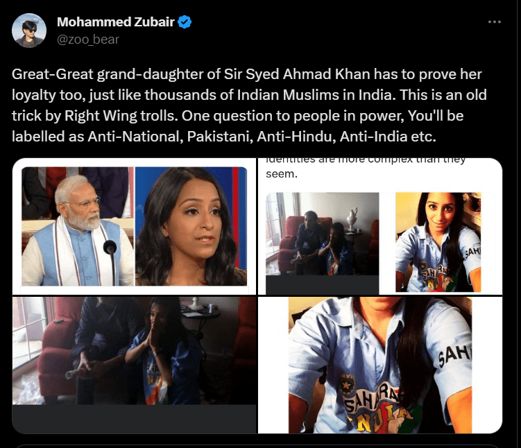 In a tweet on Saturday (June 24), Zubair wrote, “Great-Great grand-daughter of Sir Syed Ahmad Khan has to prove her loyalty too, just like thousands of Indian Muslims in India. This is an old trick by Right Wing trolls. One question to people in power, You’ll be labelled as Anti-National, Pakistani, Anti-Hindu, Anti-India etc.”