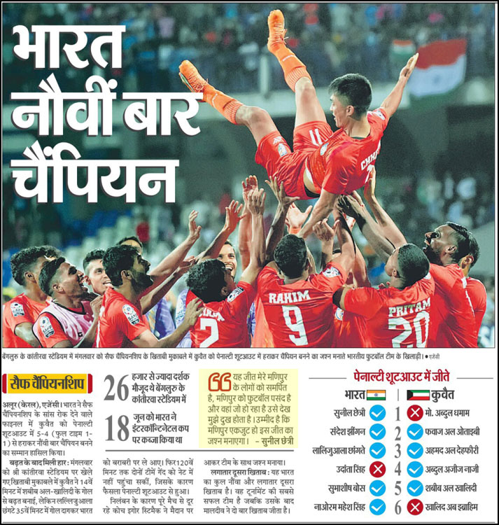On July 4, the Indian Football team led by Sunil Chhetri defeated Kuwait in a penalty shootout to win the South Asian Football Federation (SAFF) Championship for the 9th time.