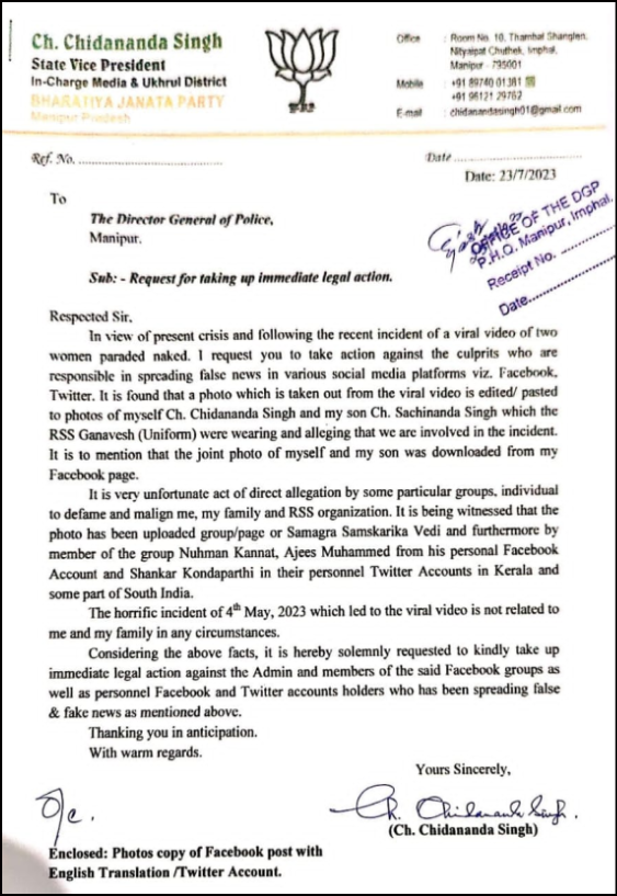 On the 23rd of July, BJP State Vice-President Chidananda Singh himself came out to bust the fake news. He wrote a letter to the Manipur DGP requesting to initiate legal action in this matter. In the letter, he gave the names of some of the handles or groups that have shared the fake news and asked the DGP to take necessary actions against them.