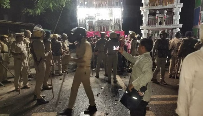 The instance took place near the Surjmal Stadium, after the Muslim side wanted to divert from the approved route and enter the facility. They assaulted the cops when they forbade the same and sealed the stadium gates.