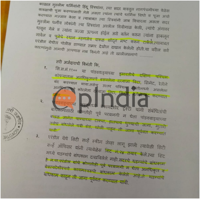 The Pandav wada sites in the Erandol region of Jalgaon district, are claimed to be under Islamic encroachments. It is believed that the Pandavas spent their years in exile in the Erandol region and that the Hindu and Jain temple-like structures built here are 800-1000 years old. Later due to the severe indifference among Hindus, Muslims slowly started encroaching on Pandav Wada more than 125 years ago, and they eventually built a mosque there while claiming it to be Wakf property.