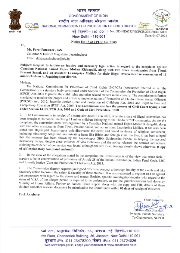 In a letter to IAS Parul Patwari, Collector and District Magistrate, Jagatsingpur, the NCPCR stated that around 11 Hindu minor children were being illegally converted in an event that was organized by a Canadian national named Eapan Mohan Kidangalil along with two other missionaries from Tirtol.