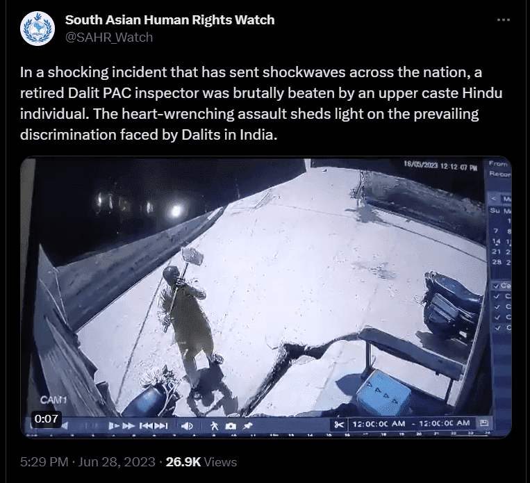 In a tweet, it alleged, “In a shocking incident that has sent shockwaves across the nation, a retired Dalit PAC inspector was brutally beaten by an upper caste Hindu individual. The heart-wrenching assault sheds light on the prevailing discrimination faced by Dalits in India.”