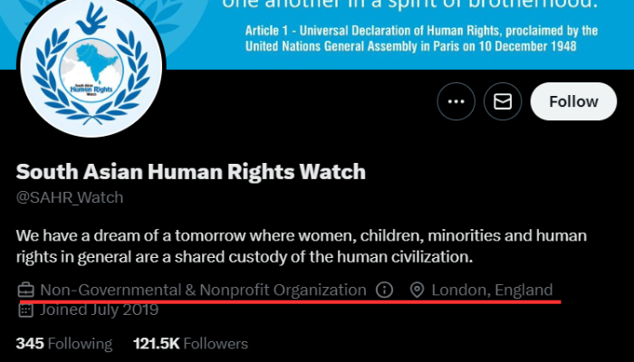 The Twitter handle ‘South Asian Human Rights Watch (@SAHR_Watch)’ claims to be a non-governmental and non-profit organisation, based in London in the United Kingdom.