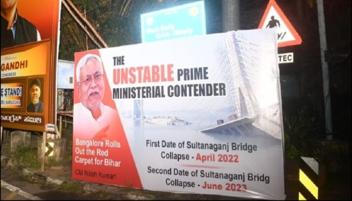 The poster read, “The unstable Prime Ministerial contender. Bangalore rolls out the Red Carpet for Bihar CM Nitish Kumar. First date of Sultanganj bridge collapse – April 2022. Second date of Sultanganj bridge collapse – June 2023.”