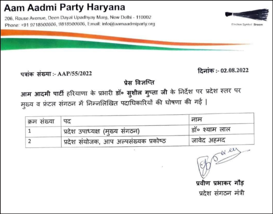 While searching, OpIndia also came across a press note released by the Aam Aadmi Party, Haryana unit on August 2, 2022, which announced Javed Ahmed’s appointment as the state coordinator of AAP’s minority cell.