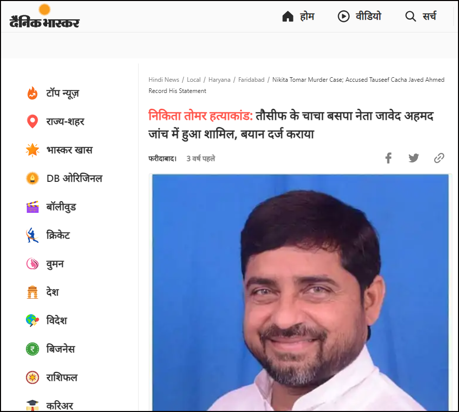 In fact, a report published by Dainik Bhaskar in the year 2020, when the Nikita Tomar murder happened, also identified Javed Ahmed, who was then a Bahujan Samaj Party leader, as Tauseef’s uncle. The report shared the picture of Javed Ahmed and carried the headline in Hindi, which roughly translated to “Nikita Tomar murder: Tauseef’s uncle BSP leader Javed Ahmed joins investigation, records statement.”
