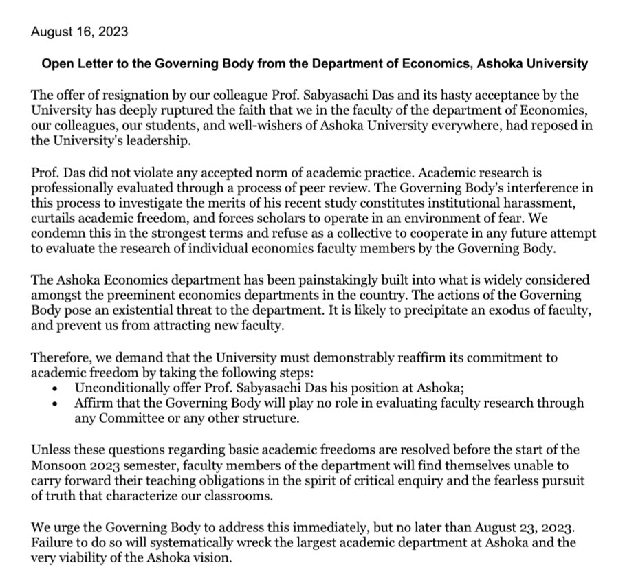 In an open letter, the faculty members of the Department of Economics at Ashoka University have condemned the University’s decision to accept Sabyasachi Das’ resignation in a ‘hasty’ manner. They have written that the University’s stance of evaluating Das’ research paper on its merits constitutes ‘institutional harassment’ and the University should not interfere in the academic process.