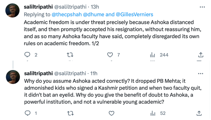 “Ashoka University is a private institution. Parents pay huge fees. Faculty has to be accountable, answerable, and responsible. It is not their divine right to live off others’ money and do whatever they wish. Even municipality offices do not allow that anymore. PS: Similar threat of dire consequences was heard when Raghuram Rajan was not given an extension. Our Left-Liberal ‘intellectuals’ lack imagination”, posted Kanchan Gupta, Senior Adviser, Ministry of Information & Broadcasting, Government of India.
