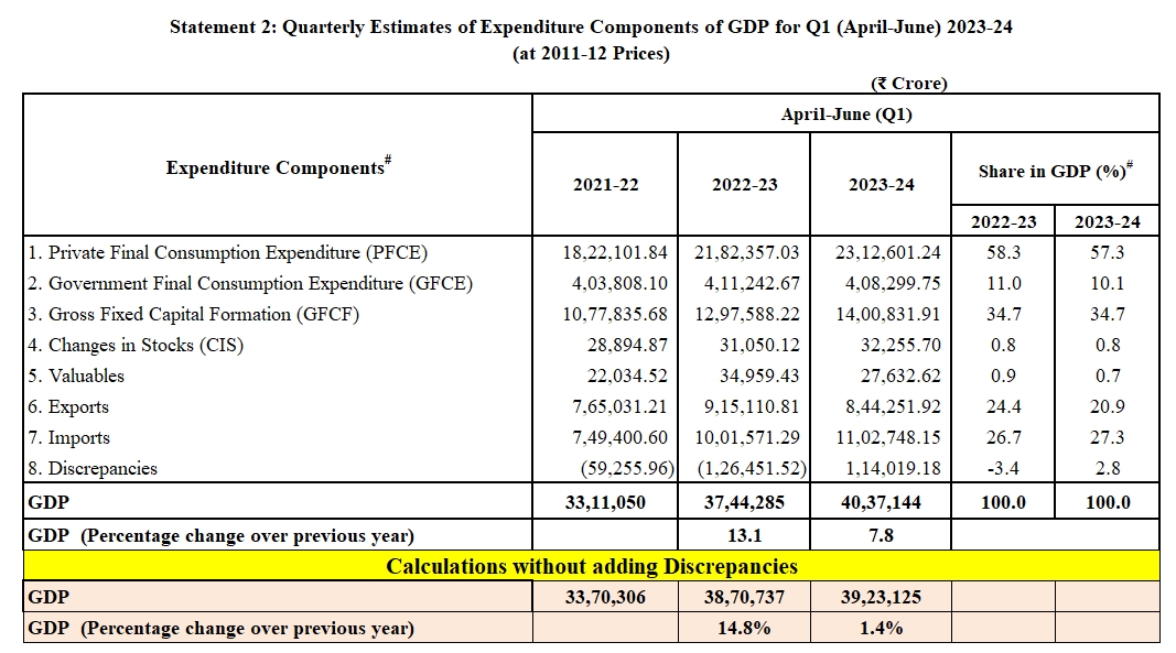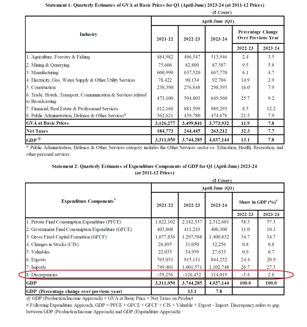 For this, he used the “Quarterly Estimates of Expenditure Components of GDP for Q1 (April-June) 2023-24” table in the NSO report, which contains the discrepancy number, which is basically the difference between income and expenditure for that period. It shows that the GDP change under expenditure is 7.8%, the same as the change in the Gross Value Added (income) table.