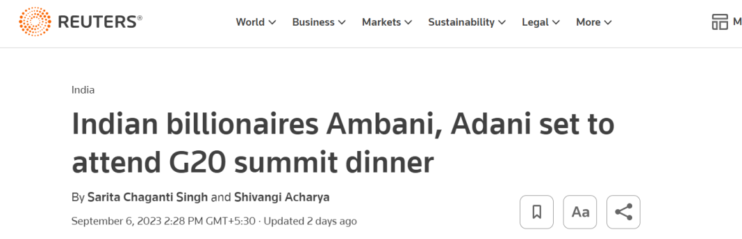 Notably, on September 6, Reuters published a report with a headline that read, “Indian billionaires Ambani, Adani set to attend G20 summit dinner.”