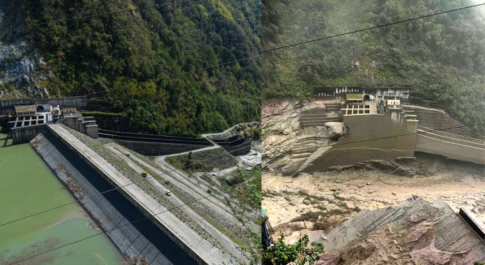 A major disaster took place in Sikkim yesterday (4th October), when the Chungthang Hydro-Dam was washed away by flooding of the Teesta River. Flash floods severely affected several districts in the area and have caused major destructions, and several bridges also have been washed away by the strong water currents. A bridge connecting the powerhouse was also washed away.