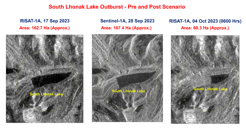 NDMA added that Satellite images received from NRSC (ISRO) reveal that more than half the South Lhonak Lake has been drained out due to the GLOF. The NRSC satellite imagery showed that the lake was spread over approximately 162.7 hectares. Its area increased to 167.4 hectares on September 28 and then drastically reduced to 60.3 hectares. This means water in over 100 acres of area drained out.