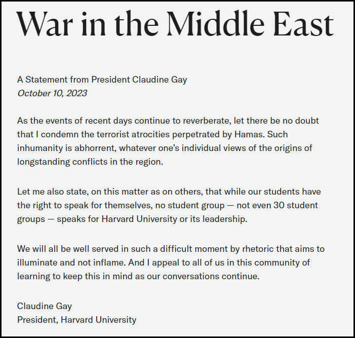 "Let there be no doubt that I condemn the terrorist atrocities perpetrated by Hamas. Such inhumanity is abhorrent, whatever one’s individual views of the origins of longstanding conflicts in the region." Read more from President Claudine Gay. https://t.co/yXS0cvADes