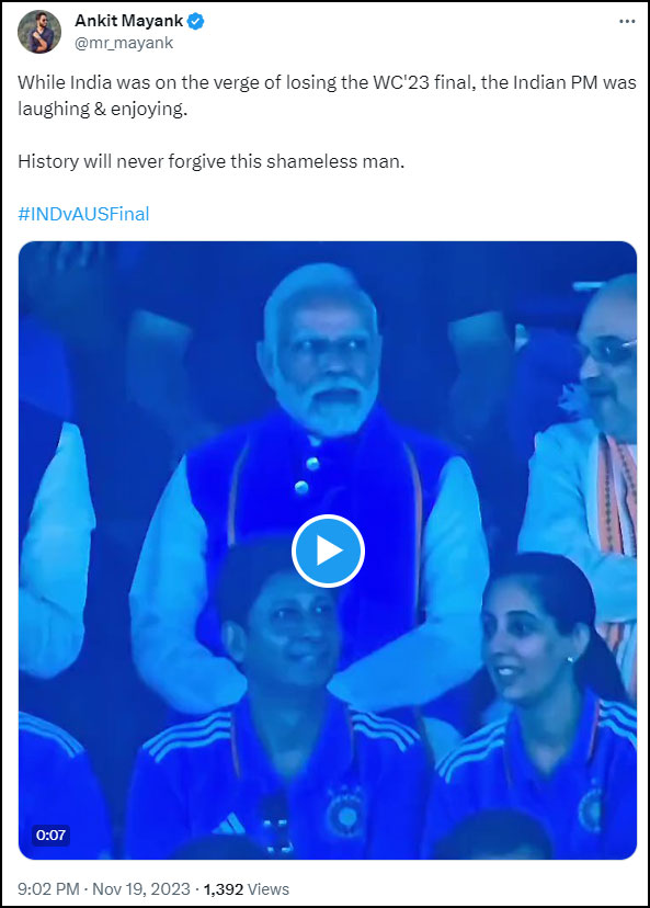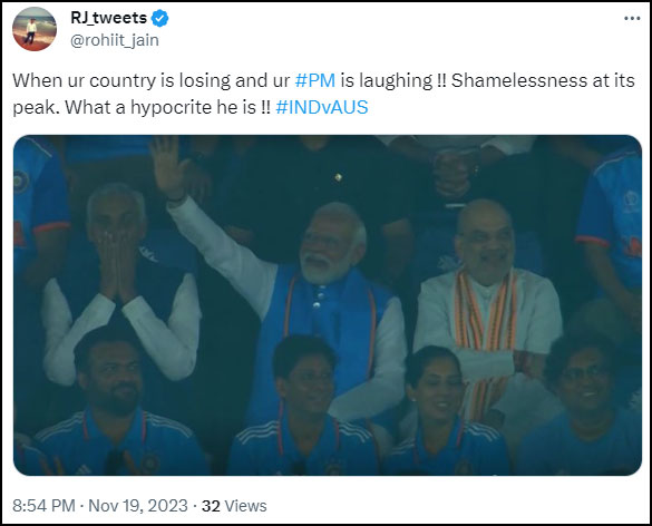 Congress supporter Ankit Mayank wrote, “While India was on the verge of losing the WC’23 final, the Indian PM was laughing & enjoying. History will never forgive this shameless man.”