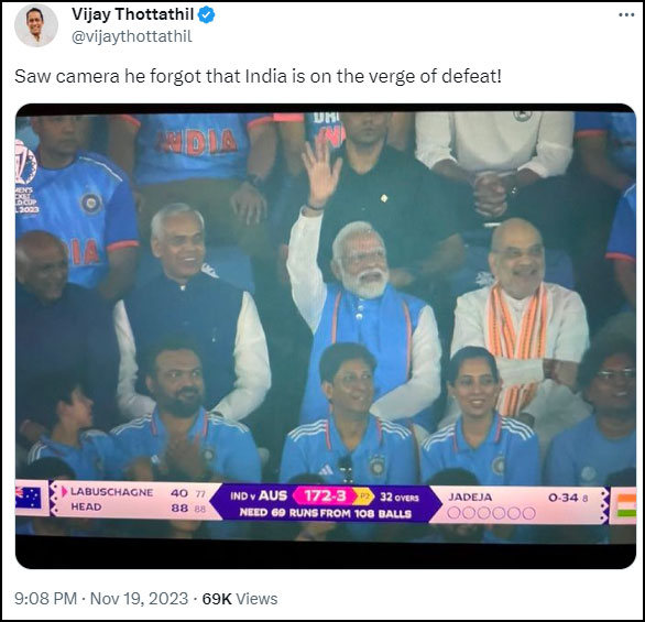 Srinate was not the only Congress leader or fan who pointed finders at PM Modi. Vijay Thottathil, who calls himself an “Indian National Congress Soldier forever” in his X bio, posted a screenshot of the same time and questioned why PM Modi was waving when India was on the verge of defeat.