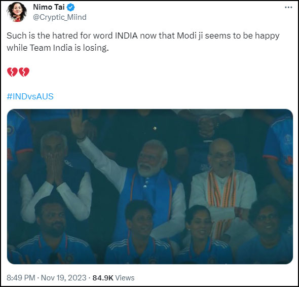 Pro-Congress and fake news peddler X user Cryptic Miind wrote, “Such is the hatred for word INDIA now that Modi ji seems to be happy while Team India is losing.”