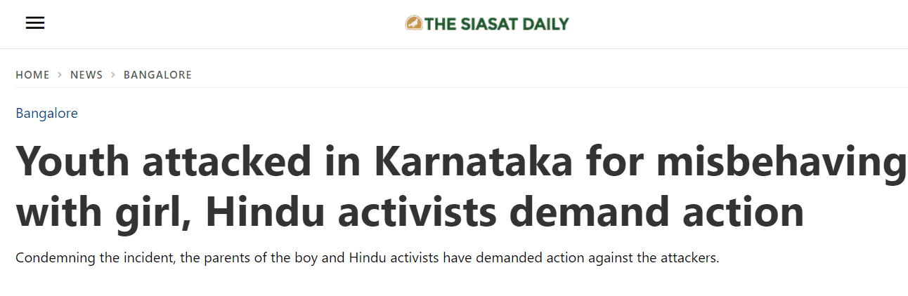 Hindu groups were also maligned as elements supporting a man accused of misbehaviour against a woman. “Youth attacked in Karnataka for misbehaving with girl, Hindu activists demand action,” wrote The Siasat Daily.