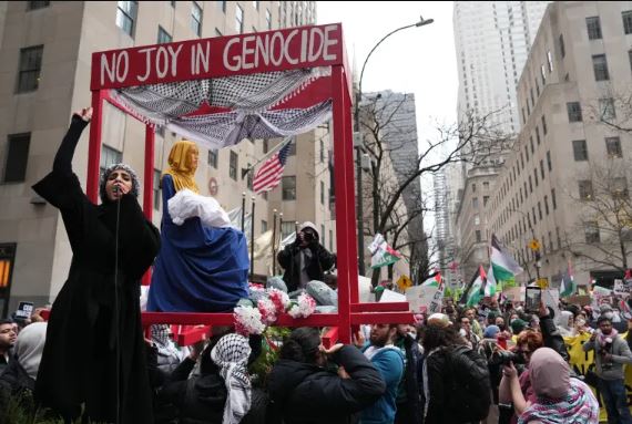 As they chanted slogans, protesters were seen throwing fake blood on a mock nativity scene, which celebrate the birth of Jesus. The protestors carried the blood-covered Nativity scene stating “No Joy In Genocide,” across the Big Apple on their shoulders while chanting “Christmas is cancelled here.”