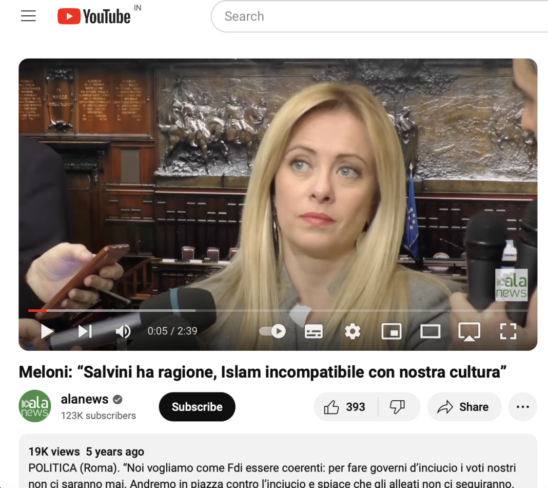 In the video, Meloni is seen saying, “Salvini says that Islam is incompatible with the constitution? Ask him for clarification, but I believe that Islam certainly presents incompatibility with our values and our civilization, and what happens in Islamic centers demonstrates this. This does not mean generalizing, but there is an incompatibility with our culture.”