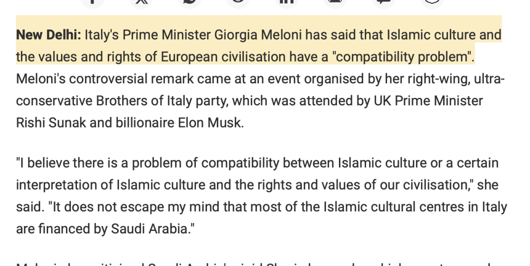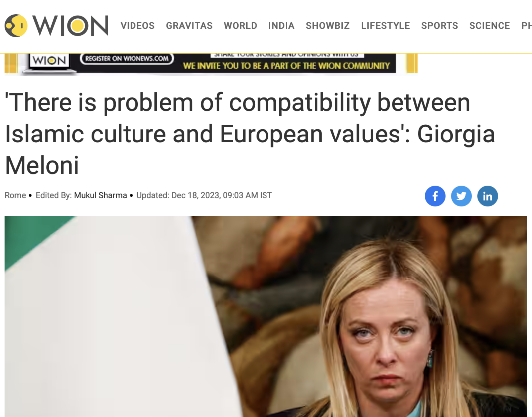 Italian PM Giorgia Meloni: “I believe that there is a problem of compatibility between Islamic culture and the values and rights of our civilization. The Islamic cultural centers in Italy are financed by Saudi Arabia where Sharia is in force. In Europe there is a very… pic.twitter.com/wEn8Fl4JC2