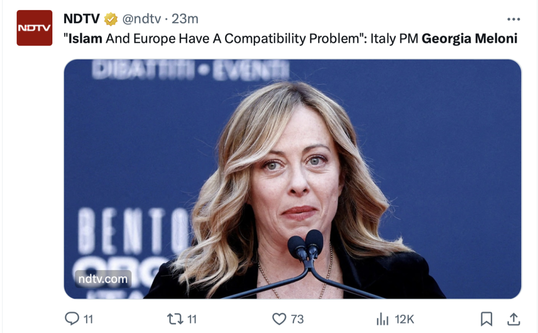 ◆ इटली की प्रधानमंत्री जॉर्जिया मेलोनी ने कहा #Europe #Islam | #GeorgiaMeloni pic.twitter.com/VRiLgytMfs