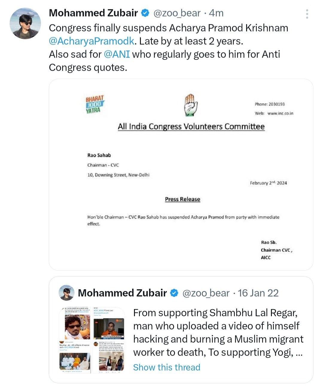 In a tweet, Mohammed Zubair claimed, “Congress finally suspends Acharya Pramod Krishnam. Late by at least 2 years. Also sad for ANI who regularly goes to Anti-Congress quotes.”