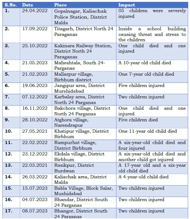 The commission took suo moto cognisance of several blast cases in which the minor children either accidentally died or were left severely injured. The authorities investigated a blast in an illegal firecracker store in Bengal’s South 24 Parganas district, an explosion in the Jangipur area in Murshidabad District, a blast in the Atghora village in Narendrapur and also in Khatipur village located in Birbhum. In the majority of the cases, the Commission highlighted that the local administration failed to take steps in favor of the children who accidentally fell victim to the incidents and instead blamed the families of the victims for their negligence.
