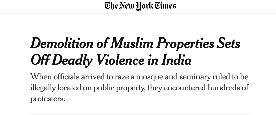 The New York Times published an article titled ‘Demolition of Muslim Properties Sets Off Deadly Violence in India’, authored by one Sameer Yasir, who conveniently ignored to mention in its headline that the ‘Muslim properties’ stood upon encroached lands. The demolition was carried out by state authorities, but the New York Times blamed Hindus, including the consecration ceremony of Ram Mandir, responsible for ‘unleashing a wave of violence’ surrounding ‘Muslim sites’.