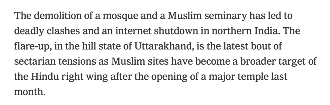 The article starts by stating that the demolition of a mosque and a Muslim seminary has touched off a wave of violence in Uttarakhand’s Haldwani, describing it as the “latest bout of sectarian tensions as Muslim sites have become a broader target of the Hindu right-wing after the opening of the major temple last month.”