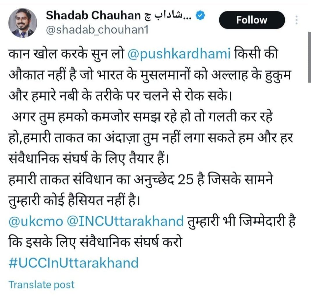 Shadab Chauhan further warned, “Our source of strength is Article 25 (Right to Freedom of Religion) of the Indian Constitution. You stand no chance before that. He then called upon the Congress party in Uttarakhand to continue the ‘constitutional struggle’ as suggested by him.