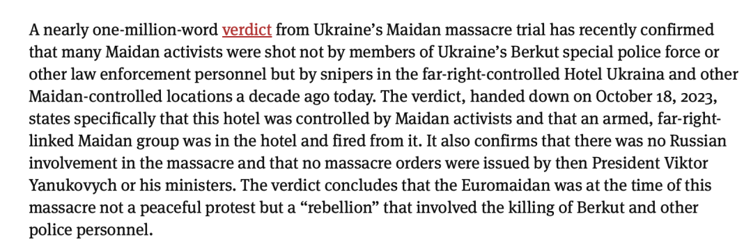 Shortly before the 10th anniversary of the Maidan massacre, a trial verdict has confirmed in October 2023 that the Maidan protestors were shot dead not by the then government, but by snipers located in Maidan-controlled buildings. The verdict also highlights that after the ‘orchestrated’ firing on the Maidan activists, the subsequent media narrative, political decisions, and statements from the Western world have been mostly misleading, propagating a wrong trope of ‘good Ukraine’ and blaming Russia for everything.