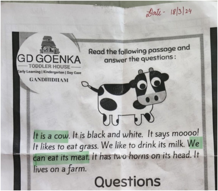 The incident took place at GD Goenka Private English Medium School in Gandhigam, Kutch. As per the reports, the school administration has made attempts to negatively influence the young minds of the school children. Controversy erupted as a photo of a cow was accompanied by the caption in the study material of the school children. “This is a cow. It is black and white. It says Mooo. It likes to eat grass. We love to drink its milk. We can eat its meat. It has two horns on its head and likes to live in the field,” the material read.