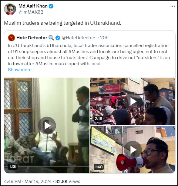 Fake news peddler Md Asif Khan wrote, “Muslim traders are being targeted in Uttarakhand.” He conveniently ignored to mention why Muslims were asked to leave the region.