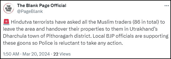 X user PageBlank also called Hindus “terrorists” for asking Muslims to leave the region. The handle conveniently ignored the reason behind the call and wrote, “Hindutva terrorists have asked all the Muslim traders (86 in total) to leave the area and handover their properties to them in Utrakhand’s Dharchula town of Pithoragarh district. Local BJP officials are supporting these goons so Police is reluctant to take any action.”