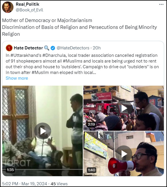 X user book_of_evil claimed it was discrimination based on religion and claimed the minority religion was being persecuted. Interestingly, he also ignored the reason behind the demand for Muslims to leave the region.